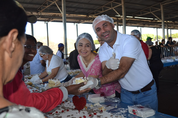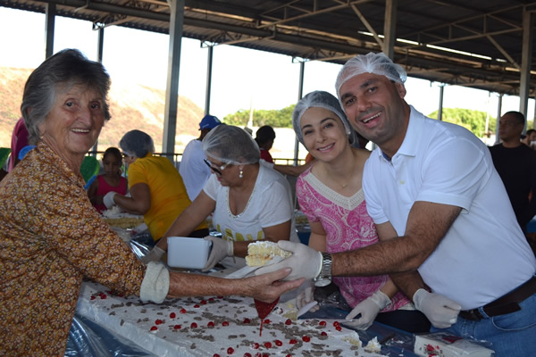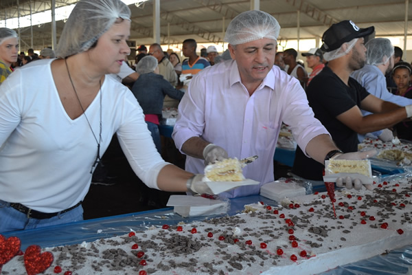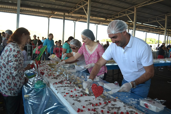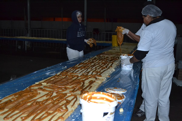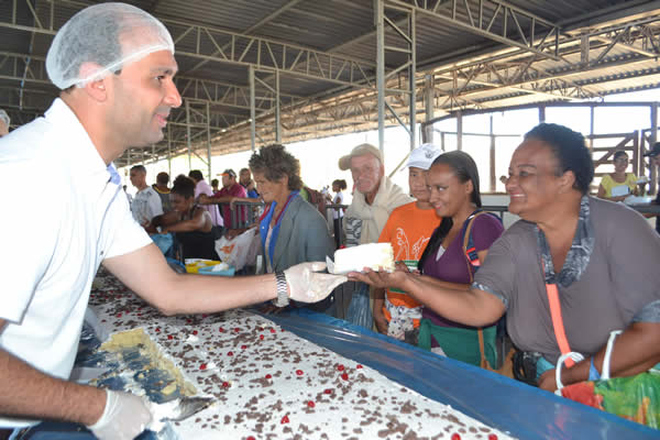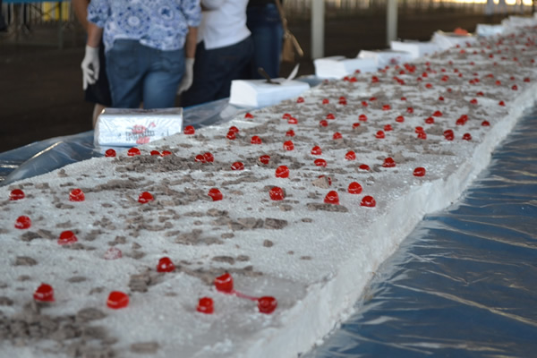 O bolo de 132 metros foi recheado com doce de leite, com cobertura marshmallow, chocolate picado e cereja. Foram distribuídos água e mais de 6 mil sucos de laranja.