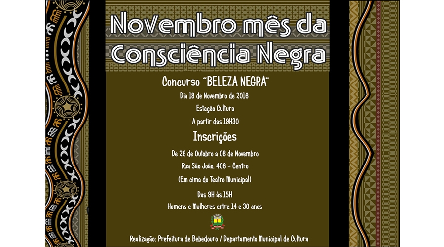 A Prefeitura de Bebedouro, por meio do departamento de Cultura e Conselho Municipal da Participação e do Desenvolvimento da Comunidade Negra, realiza em 18 de novembro, às 19h30, na Estação Cultura, o Concurso Beleza Negra 2016. O evento faz parte do Mês da Consciência Negra, celebrado em novembro.