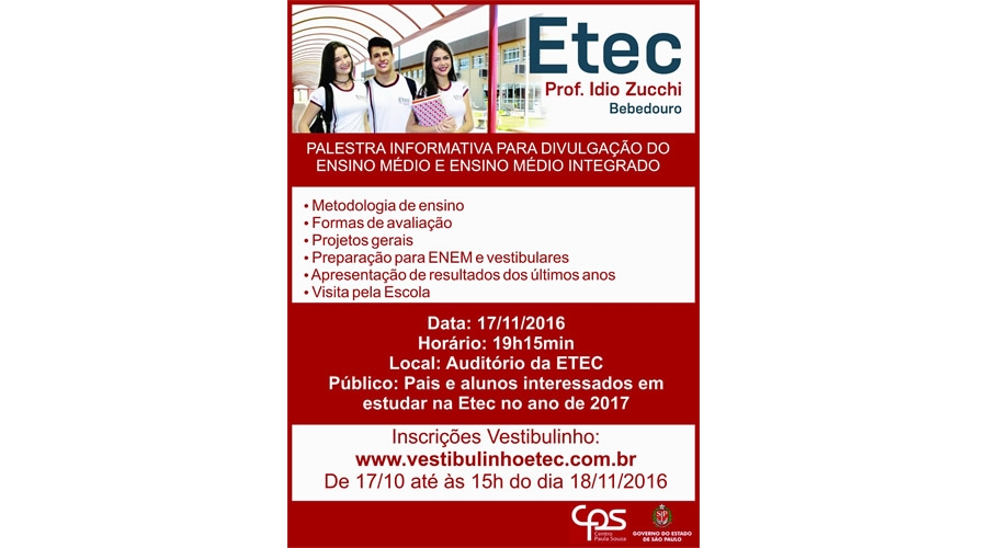 A Etec Prof. Idio Zucchi Bebedouro, realizará na quinta-feira, 17 de novembro, palestra para divulgação do Ensino Médio e Ensino Médio Integrado. As informações são destinadas aos interessados em ingressar na instituição no ano de 2017. A palestra será realizada ás 19h15, no auditório da Etec, localizado na Rua Lúcio Sarti, 809 - Parque Eldorado.