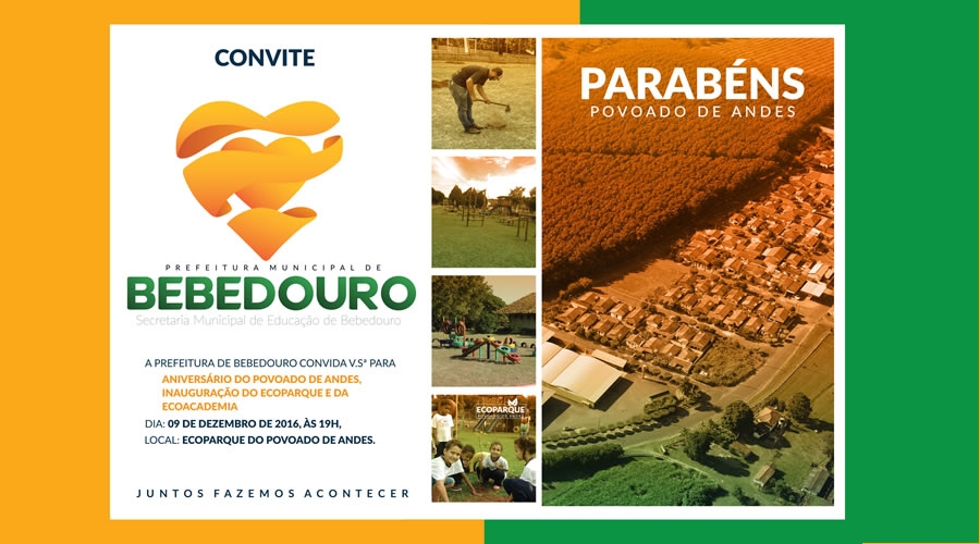 A Prefeitura de Bebedouro, comemorará na sexta-feira, 09 de dezembro, o aniversário de 114 anos do Povoado de Andes e realizará a inauguração do Ecoparque e da Ecoacademia. O evento será realizado na Praça Central, às 19h.
