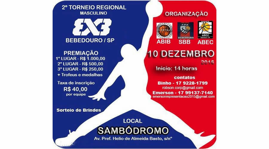 A Prefeitura de Bebedouro, por meio do Departamento Municipal de Esportes, apoiará o 2º Torneio de Basquete 3X3. O Torneio organizado pela ABEC (Associação Bebedourense de Esporte e Cultura), SBB (Sambódromo Basquete Bebedouro), será realizado no Sambódromo Municipal, no sábado, 10 de dezembro, a partir das 14h.