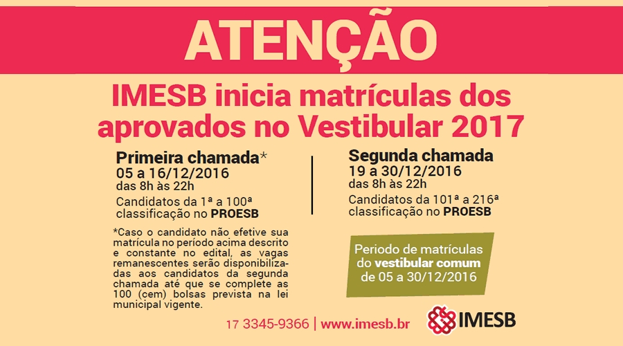 O Instituto Municipal de Ensino Superior de Bebedouro “Victório Cadassi”, está com o período de matriculas abertos para os aprovados no Vestibular 2017. As matriculas podem ser realizadas no Instituto, localizado na Rua Nelson Domingos Madeira, 300 - Parque Eldorado, até o dia 30 de dezembro, das 8h às 22h.
