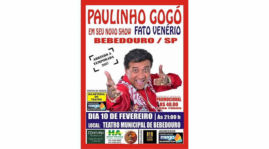 Abrindo a temporada 2017 de peças teatrais, o comediante Paulinho Gogó apresenta em 10 de fevereiro (sexta-feira), às 21h, seu novo show “Fato Venério”. Os ingressos já estão à venda por R$ 40,00 - em preço promocional para todos, e podem ser adquiridos por meio do site: megabilheteria.com ou na bilheteria do teatro, rua São João – 406 – centro, informações pelo telefone 3343.3472. A entrada é permitida para maiores de 10 anos.