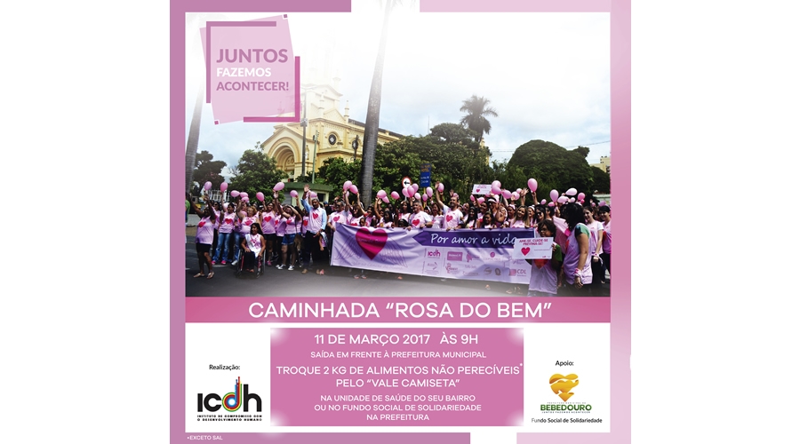 Caminhada Rosa do Bem O ICDH (Instituto de Compromisso com o Desenvolvimento Humano) em parceria com a prefeitura de Bebedouro (Fundo Social), iniciam os preparativos para a Caminhada “Rosa do Bem”, que será realizada no dia 11 de março, com saída em frente a Prefeitura, às 9H. A ação pretende mobilizar à população para a importância da prevenção do câncer de mama. Participe trocando 2 quilos de alimentos não perecíveis (exceto sal), por um vale camiseta nas unidades de saúde de seu bairro ou no Fundo Social na prefeitura. Os alimentos arrecadados serão doados ao Hospital Municipal Júlia Pinto Caldeira.
