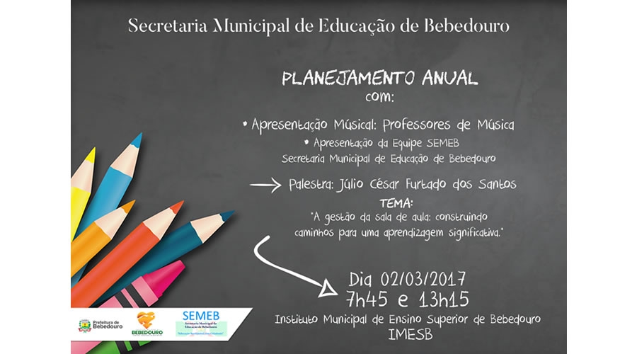 Na quinta-feira, 2 de março, haverá encontro no anfiteatro do Imesb (Instituto Municipal de Ensino Superior de Bebedouro), no período da manhã, a partir das 7h45, e a tarde a partir das 13h15, com a apresentação geral da equipe da Semeb (Secretaria Municipal de Educação de Bebedouro), das propostas pedagógicas e alinhamento dos trabalhos entre equipe gestora e corpo docente do município.