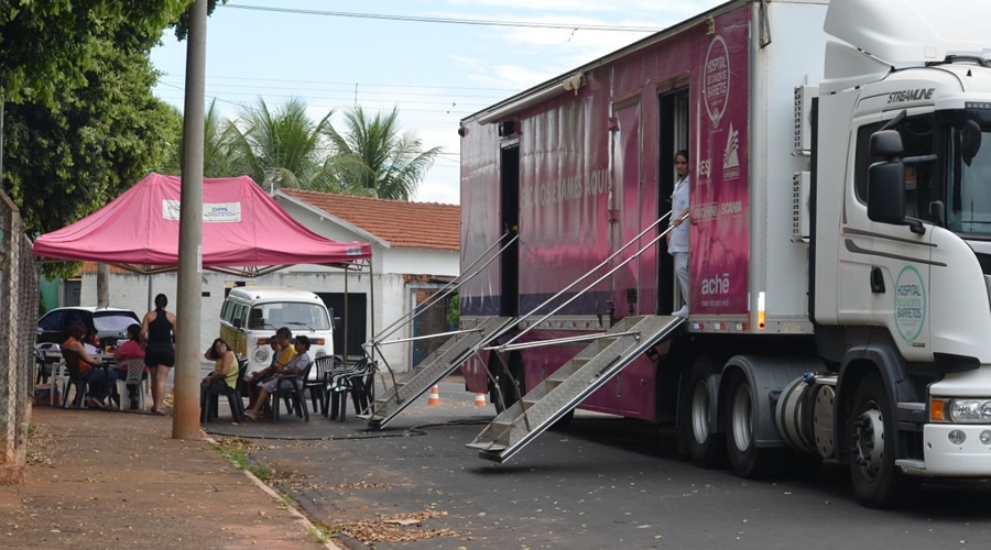 Nesta segunda-feira, 27 de março, as carretas do Hospital de Câncer de Barretos, estão estacionadas ao lado da UBS Dr. José Deocleciano Ribeiro Filho, no Jd. Aeroporto e ESF Dr. Ulisses de Carvalho, Jardim Alvorada, atendendo mulheres que residem próximas as unidades. Estão sendo disponibilizados exames de mamografia, Papanicolau, boca e - colorretal – que pela primeira vez é oferecido à população.
