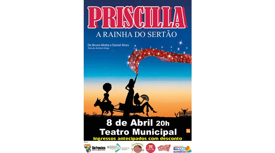 Priscilla, um musical de versões literais de grandes sucessos musicais, capaz de fazer o público rir e se emocionar, será apresentado no sábado, 8, às 20h. Os ingressos estão à venda, com desconto de 50% para compra antecipada, na bilheteria do teatro ou pelo site mega bilheteria.