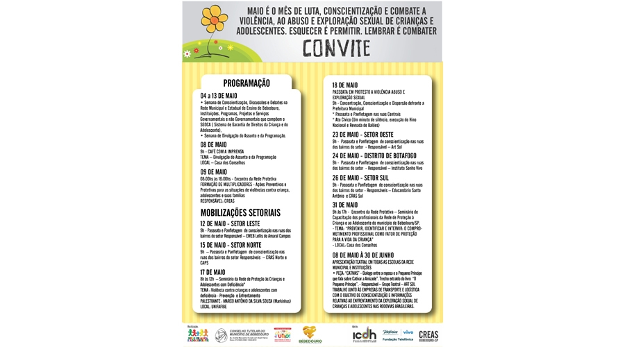 Pelo quinto ano consecutivo, Bebedouro participa do “Combate ao Abuso e à Exploração Sexual contra Crianças e Adolescentes”. A programação que será realizada nos meses de maio e junho foi apresentada na manhã de segunda-feira (8), na Casa dos Conselhos, e conta com passeatas, panfletagem, apresentação teatral, palestras e seminário. O evento é idealizado pela Rede Criança e Adolescente, CMDCA (Conselho Municipal de Direitos da Criança e do Adolescente), em parceria com a Prefeitura, por meio da Semeb (Secretaria Municipal de Educação de Bebedouro) e Cras (Centro de Referência da Assistência Social), e apoio do ICDH (Instituto de Compromisso com o Desenvolvimento Humano).