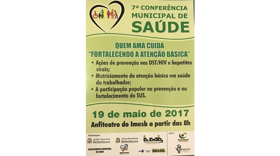 Na próxima sexta-feira, 19 de maio, será realizada a 7ª Conferência Municipal de Saúde com o tema: Quem Ama, Cuida - “Fortalecimento a Atenção Básica”- visando a melhora na qualidade da saúde em Bebedouro. O evento discute e levanta com a população em geral, representantes de entidades, profissionais da saúde quais as propostas para a elaboração do Plano Municipal de Saúde, válido por quatro anos.