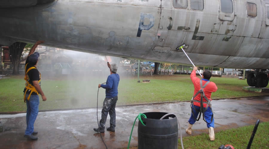 Segundo o sócio proprietário da empresa BNC- Serviço de Limpeza, Claudemir Natale, para qualificar os trabalhos, foi aplicado com a ajuda de uma plataforma elevatória, detergente neutro em todo o avião e enxague com máquina de alta pressão. “É um trabalho que exige dedicação, pois se trata de um patrimônio, sendo necessário muito cuidado. Porém essa manutenção é fundamental, pois todos precisam trabalhar pelo bem comum”, comenta o voluntário.