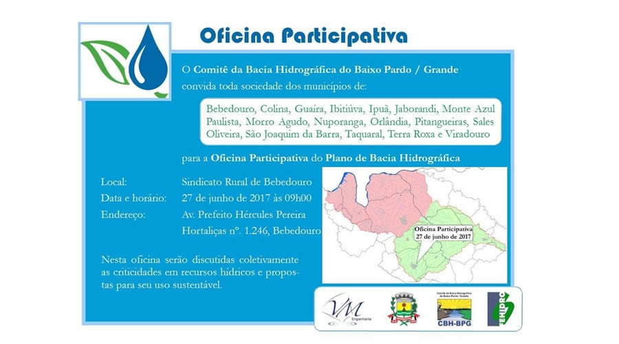 O Comitê da Bacia Hidrográfica do Baixo Pardo/Grande realiza no dia 27 de junho (terça-feira), a partir das 9h, no Sindicato Rural de Bebedouro, Oficina Participativa do Plano de Bacia Hidrográfica, em uma consulta pública, com a participação de representantes de 16 municípios. O evento está a cargo da empresa VM Engenharia de Recursos Hídricos, que presta serviços ao SAAEB.
