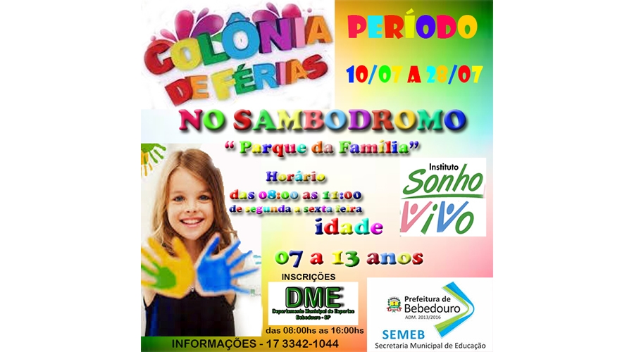 A Prefeitura de Bebedouro em parceria com o Instituto Sonho Vivo realizarão a Colônia de Férias, a partir do dia 10 de julho. A programação que se estenderá até o dia 28 de julho, e é voltada para crianças e adolescentes de 7 a 13 anos, realizada no Parque da Família, localizado no Sambódromo Municipal, das 08h às 11h de segunda a sexta-feira.
