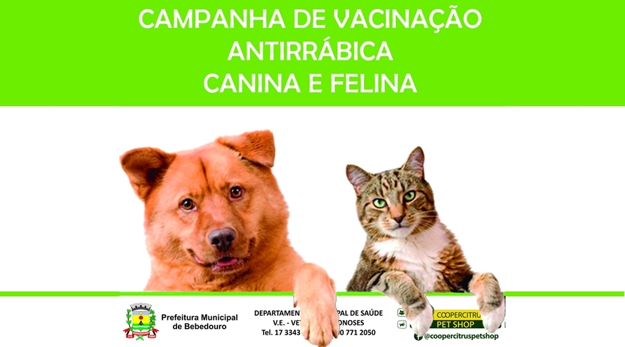 A Prefeitura de Bebedouro, através da Vigilância Epidemiológica - Vetores e Zoonoses, inicia no sábado (05/08), a Campanha de Vacinação Antirrábica, que começa pelo distrito de Turvínia e povoado de Andes. No sábado, dia 12, será no distrito de Botafogo. A vacinação será a partir das 8 horas de casa em casa.