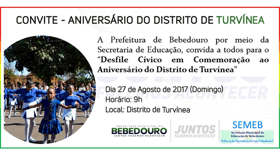 A comemoração dos 95 anos do distrito de Turvínea acontece no domingo, 26 de agosto, às 9h, com Desfile Cívico.