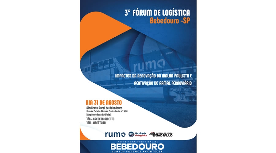 O 3º Fórum de Logística de Bebedouro que acontece na quinta-feira, 31 de agosto, nas dependências do Sindicato Rural, a partir das 18h, em parceria com o Governo do Estado e a Rumo Logística, tem como tema: “Impactos da Renovação da Malha Paulista e a Reativação do Ramal Ferroviária”.