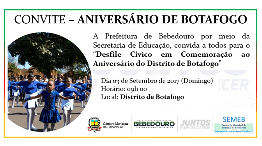 No domingo, 03 de setembro, a Prefeitura, por meio da SEMEB (Secretaria Municipal de Educação de Bebedouro) realizará o Desfile Cívico, em comemoração ao aniversário do Distrito de Botafogo. Na ocasião, participarão do desfile o Tiro de Guerra de Bebedouro, EMEB Yolanda Giglio Vilella, Banda Praticare e EMEB Profª Izabel Motta Silva Cardoso. Terá bolo comemorativo. O evento começa às 9h.