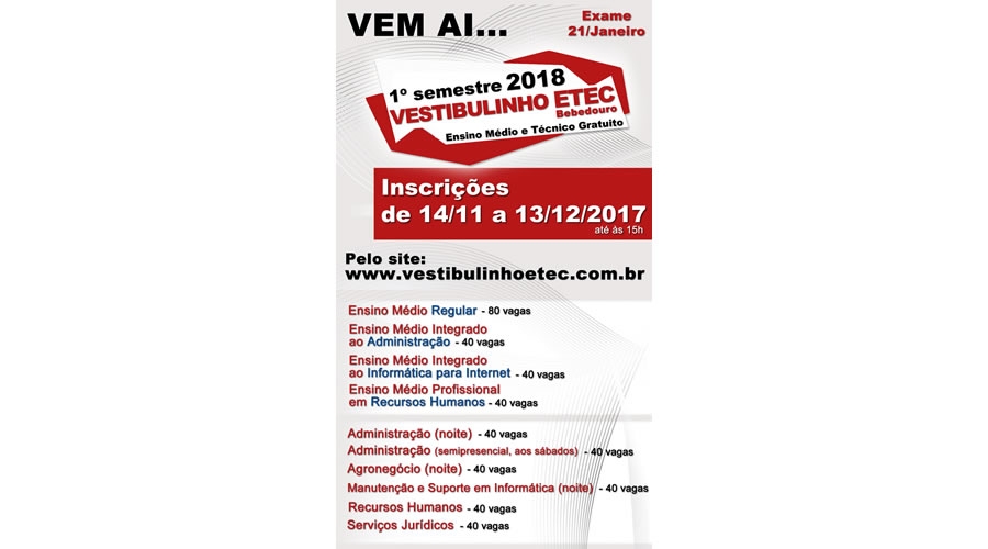 A partir de terça-feira (14/11) até 13 de dezembro, a ETEC de Bebedouro, estará com as inscrições abertas para o Vestibulinho 1º Semestre/2018. Os interessados podem se inscrever pelo site www.vestibulinhoetec.com.br.