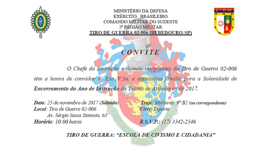 O Tiro de Guerra de Bebedouro 02-006 realizará no sábado, 25 de novembro, a solenidade de encerramento do ano de instrução da turma de atiradores de 2017. O evento será realizado às 10h, no Tiro de Guerra, localizado na Avenida Sérgio Sessa Stamato, nº 63.
