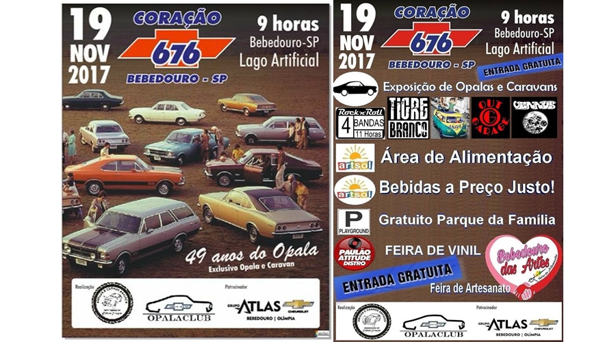 O grupo Amigos e Carros Antigos realizará no domingo (19/11), o evento Coração 676- Exposição de Opalas e Caravans. O encontro é gratuito e será realizado a partir das 9h na região do Lago Artificial.