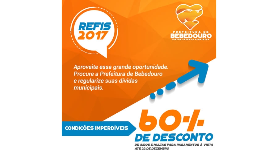 O desconto de 60% em juros e multa para pagamento à vista de tributos junto à Prefeitura de Bebedouro será concedido até 22 de dezembro. O Programa de Incentivo a Regularização Fiscal – REFIS é uma oportunidade para o munícipe acertar suas dívidas com a municipalidade.