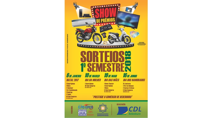 A CDL (Câmara de Dirigentes Lojistas) está realizando a primeira etapa da campanha anual “Show de Prêmios”. A iniciativa conta com o apoio do Bebedouro Shopping, Supermercado Sesé e 98 outras empresas participantes e terá a duração de aproximadamente 13 meses, contemplando sete sorteios sendo o primeiro no dia 06 de janeiro.