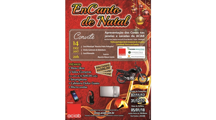 A ACIAB (Associação Comercial Industrial Agrícola Bebedouro), está realizando a campanha anual “EnCanto de Natal”. A iniciativa será realizada até o dia 31 de dezembro, contando com o apoio de diversas lojas do comércio local.