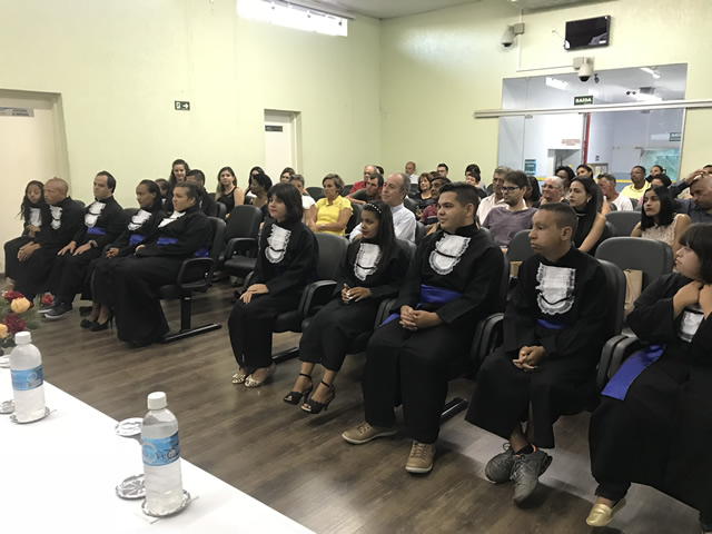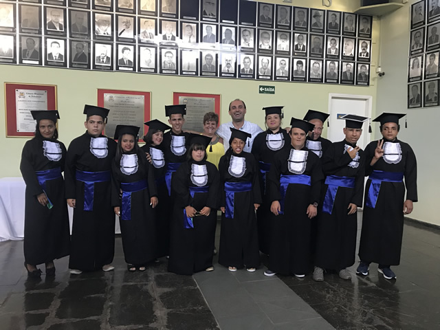 A cerimônia de entrega dos certificados contou com a presença do prefeito – Fernando Galvão, o gerente da unidade - Luiz Antônio de Lima, as docentes do programa - Rose Scatambulo e Regina Nemer, representante da Casa de Santo Expedito – Luiz Gustavo Gonçalves, coordenador de Acessibilidade - Sérgio Marin, a psicóloga da APAE Bebedouro – Grazielli Buzon da Silva e familiares dos estudantes.