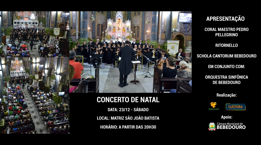 Sábado (23/12), a partir das 20h30, na matriz de São João Batista será realizado o Concerto de Natal reunindo os corais Maestro Pedro Pellegrino, Ritornello e Schola Cantorum de Bebedouro, em conjunto com a Orquestra Sinfônica de Bebedouro – em sua primeira apresentação ao público. No repertório canções natalinas e conhecidas do grande público sob a regência do Maestro Glauco Corrêa.