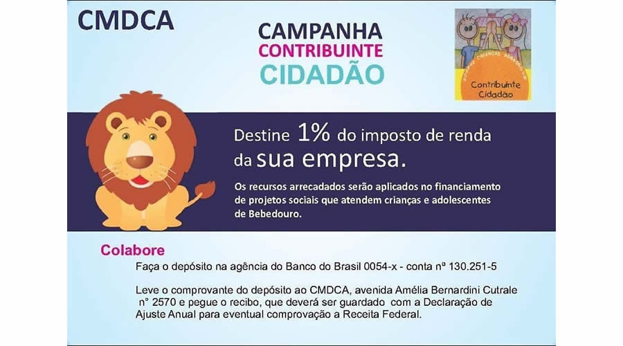 A população pode colaborar com projetos voltados à criança e ao adolescente por meio da Campanha Contribuinte Cidadão, que consiste na destinação de parte do Imposto de Renda, sendo 6% para pessoa física e 1% para empresas, ao Conselho Municipal dos Direitos da Criança e do Adolescente de Bebedouro – CMDCA.