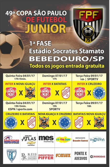 A Federação Paulista de Futebol, realizou nesta quarta-feira (03/01), a conferência de apresentação dos atletas que participarão da 49ª Copa São Paulo de Futebol Junior 2018. A cerimônia foi realizada no salão de convenções do Hotel Plaza Shopping e contou com a presença dos representantes das delegações e atletas entre elas, a Associação Atlética Internacional, que jogarão em Bebedouro, no Estádio Municipal Sócrates Stamato, nos dias 04/01 às 17h15 e 19h15, 07/01 às 17 e 19h e 09/01 às 16h e 18h.