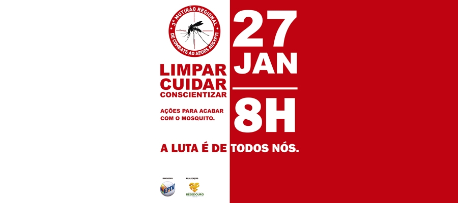 Bebedouro participa no sábado, 27 de janeiro, das 8h às 12h, do 3º Mutirão de Combate ao Aedes Aegypti, idealizado pela EPTV, que tem como objetivo eliminar os possíveis criadouros do mosquito transmissor de doenças nas 66 cidades que recebem o sinal da emissora.