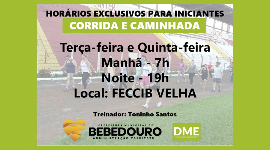 O Departamento Municipal de Esportes – DME oferece treinamento de caminhada e corrida para iniciantes em dois dias e horário: terças e quintas-feiras, às 7h e às 19h, na pista de atletismo da antiga Feccib, sob a coordenação do treinador Toninho Santos.