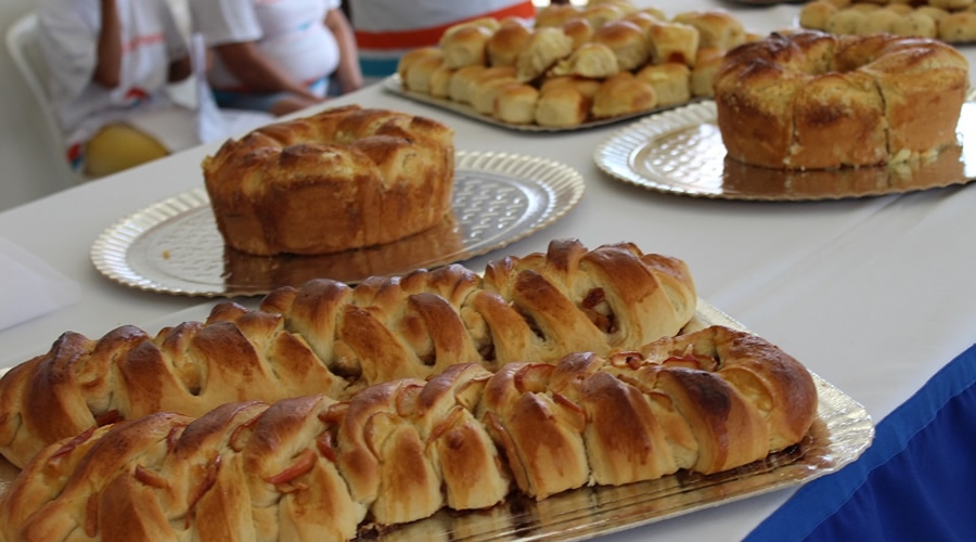 No preparo, receitas como pão de maçã com frutas cristalizadas, pão de beterraba com goiabada, pão de batata recheado com catupiry, rosca estrela e pão de mandioca. São receitas artesanais muito fáceis de preparar, sendo necessário, ingredientes e equipamentos simples. Sendo o grande diferencial que todas as receitas são desenvolvidas de forma saudável com farinha integral e base de frutas”, comenta o monitor.