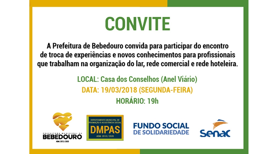 O evento é uma realização da Prefeitura de Bebedouro, por meio do departamento municipal de Promoção e Assistência Social, e Senac, com parceria do Fundo Social de Solidariedade. O evento tem vagas limitadas, as inscrições devem ser feitas no local.