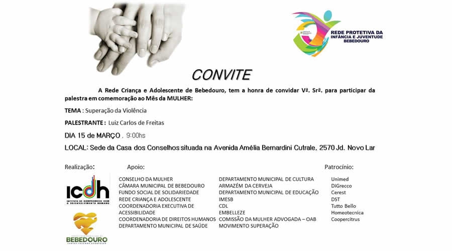 A Prefeitura de Bebedouro, por meio da Rede Criança e Adolescente, e o ICDH – Instituto de Compromisso com o Desenvolvimento Humano realizam palestra com o tema “Superação da Violência”, com Luiz Carlos de Freitas, na quarta-feira (15/03), às 9h, na Casa dos Conselhos, na avenida Amélia Bernardini Cutrale – 2570, Jd. Novo Lar. O evento faz parte das comemorações alusivas ao Mês da Mulher.