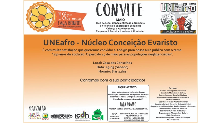 Dentro do Mês da Luta, Conscientização e Combate à Violência, ao Abuso e Exploração Sexual de Crianças e Adolescentes, a UNEAFRO – Núcleo Conceição Evaristo, realiza no sábado (19/05), das 8h às 12h, na Casa dos Conselhos, avenida Amélia Bernardini Cutrale – 2570 – Novo Lar, aula prática com o tema: “130 anos de abolição: O peso do 14 de maio para a população negligenciada”.