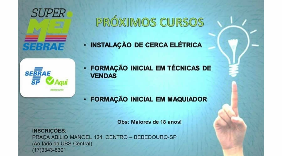 A unidade do Sebrae em Bebedouro está com inscrições abertas para  cursos gratuitos de: Instalador de Cerca Elétrica, Formação Inicial em Maquiador e Técnicas em Vendas. Os interessados precisam ter acima de 18 anos. As inscrições devem ser feitas até 13 de junho (quarta-feira), no escritório da entidade, na praça Abílio Manoel – 124 – centro (ao lado da UBS central), das 9h às 17h, informações pelo telefone (17) 3343-8301.