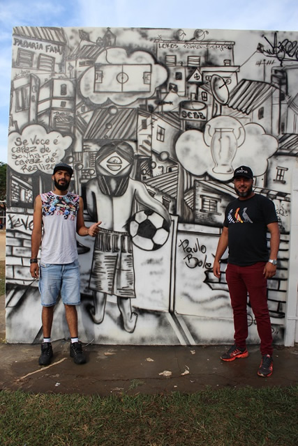A comunidade também ganhou um presente dos grafiteiros Marcelo Leandro Lima e David Henrique Moreira, que em ano de Copa do Mundo utilizaram as cores brasileiras e personagens da seleção de futebol para colorir a parte externa do banheiro da praça, dando novo colorido ao espaço.