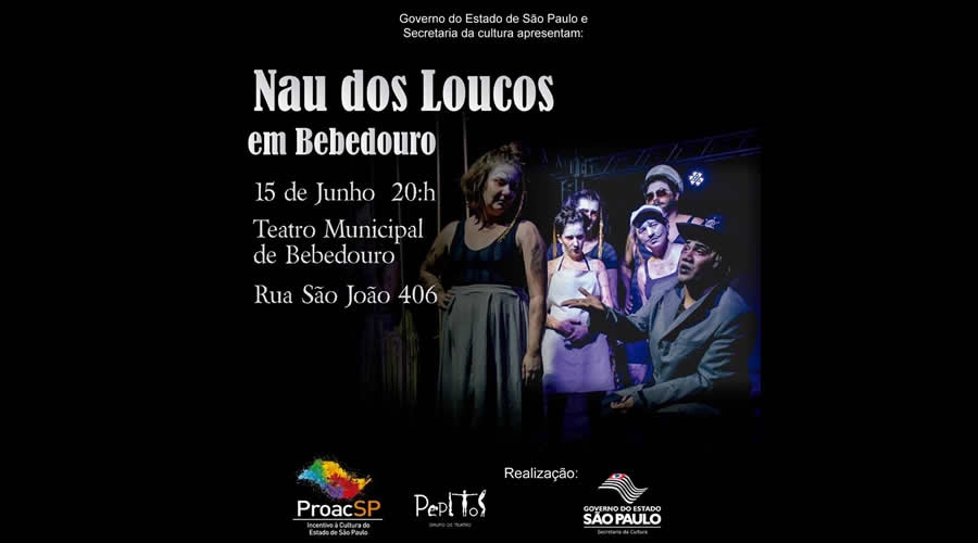 O grupo teatral “Pepitos”, de Ribeirão Preto, traz ao palco do Teatro Municipal de Bebedouro, na sexta-feira – 15 de junho - às 20h, com entrada gratuita, o mito da “Nau dos Loucos”, onde excluídos e rejeitados de todos os tipos e lugares dividem o mesmo espaço, cruzando mares e séculos, sem leis ou regras, sem capitão, sem atracar, em uma viagem sem volta. Com situações inusitadas e muito humor, os passageiros dessa estranha nau, em meio à loucura, procuram o sentido de sua busca.
