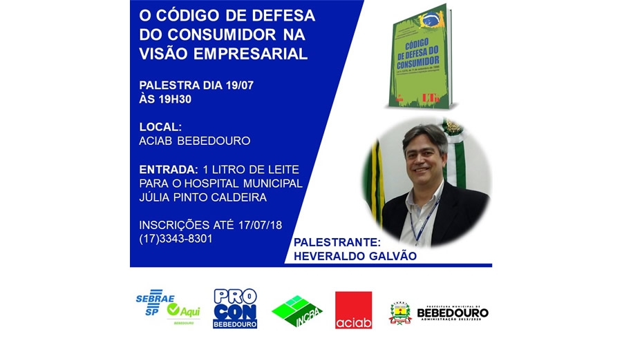 "O Código de Defesa do Consumidor na Visão Empresarial" é tema de palestra, com Heveraldo Galvão, que será realizada no dia 19 de julho, às 19h30, na Aciab, promovida pelo Sebrae Aqui e Procon, com parceria da Prefeitura de Bebedouro. O evento é voltado aos empresários e interessados pelo tema, com o objetivo de instruir sobre os direitos dos consumidores, visando maior harmonização na relação de consumo.