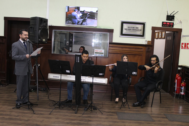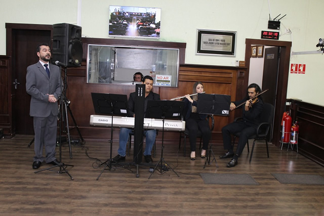 Ao receber na noite de sexta-feira, 06 de julho, na Câmara Municipal, o Título de Maestro Emérito, Glauco Carvalho Corrêa mostrou um pouco de seu talento ao interpretar algumas canções ao lado de amigos da Orquestra Sinfônica de Bebedouro. Na plateia, coralistas dos diferentes corais que rege, familiares e amigos, inclusive três que estudaram com ele na UFU – Universidade Federal de Uberlândia.