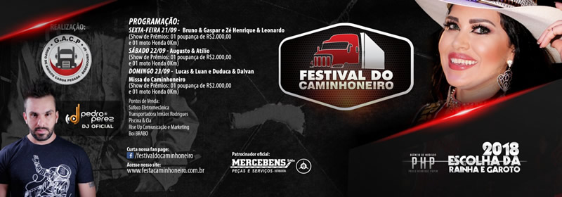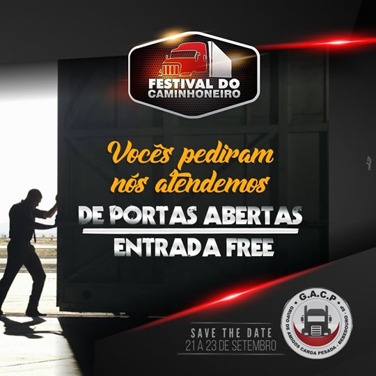 O Grupo de Amigos Carga Pesada (GACP), com apoio da Prefeitura Municipal, realizarão nos dias 21, 22 e 23 de setembro, a 18ª edição do Festival do Caminhoneiro de Bebedouro. A festa será realizada nas dependências do Centro de Eventos GACP “Odilon Januário da Costa” (antiga Feccib Nova).