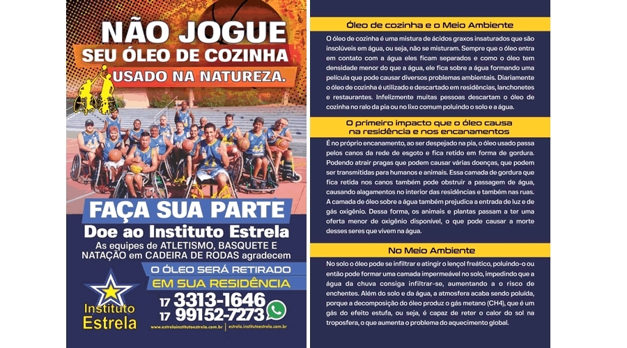 O Instituto Estrela realiza o projeto “Faça a sua parte”, que consiste na doação de óleo de cozinha usado, para que seja revertida a aquisição de cadeiras de rodas, para a prática de basquete adaptado.