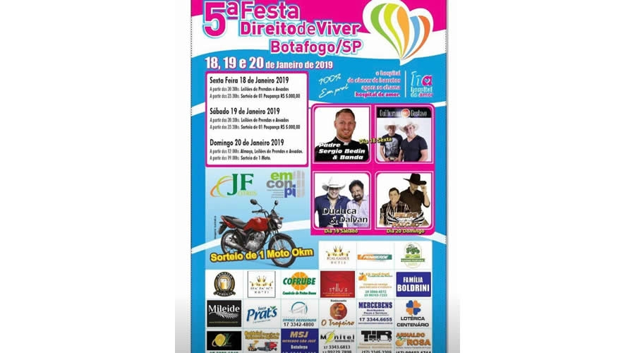A 5ª edição da Festa Direito de Viver do Distrito de Botafogo será realizada nos dias 18, 19 e 20 de janeiro (sexta-feira, sábado e domingo). A festa terá início às 20h30, na sexta e sábado, e no domingo a partir das 12h. Toda renda será revertida em prol do Hospital de Amor de Barretos.