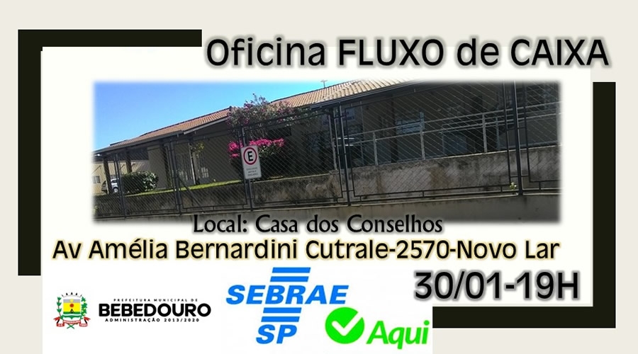 O SEBRAE Aqui Bebedouro realizará na quarta-feira (30/01), a Oficina Fluxo de Caixa. A oficina é gratuita com inicio às 19h, na sede da Casa dos Conselhos, localizado na Avenida Amélia Bernadina Cutrale (no Anel Viário).