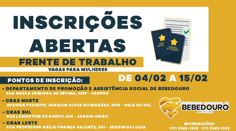 A Prefeitura de Bebedouro iniciou nesta segunda-feira (04/02), as inscrições gratuitas do Processo Seletivo para a formação de cadastro reserva do Programa de Auxílio ao Desemprego- “Frente de Trabalho”, para trabalhar em Bebedouro, Povoado de Andes e distritos de Botafogo e Turvínia, nos setores de limpeza, conservação, manutenção e restauração de bens públicos.