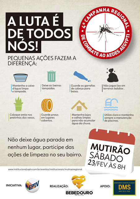 O grupo EPTV, em parceria com a Prefeitura de Bebedouro, por meio da Secretária Municipal de Saúde – setor de Vetores e Zoonoses, agentes comunitários de saúde e equipe da Estratégia de Saúde da Família, realizará a 4ª edição do Mutirão EPTV de Combate à Dengue, neste sábado (23/02). A ação que aconteceria na última semana, sábado (16/02), foi adiada, assim como em outras cidades da região, devido às chuvas.
