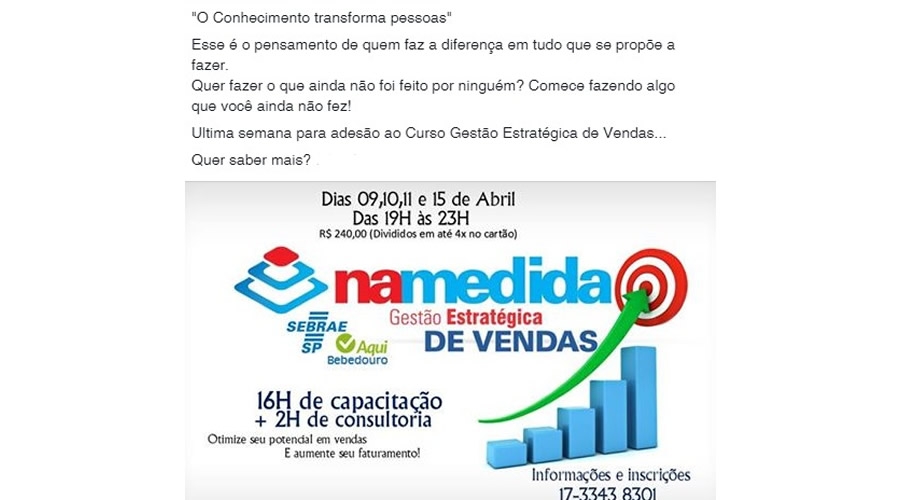 O SEBRAE Aqui realizará nos dias 09, 10, 11 e 15 de abril, o curso de Gestão Estratégica de Vendas, na sede do SEBRAE Aqui, das 19h às 23h, na Praça Abílio Manoel, nº 124, ao lado da UBS Central.