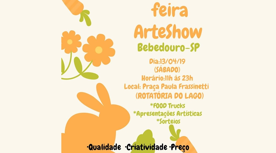 A Associação Feira "ArteShow", em parceria com a Prefeitura de Bebedouro, realiza no sábado (13/04), a tradicional Feira de Artesanato em horário estendido devido a comemoração da Páscoa. A feira especialmente nessa data ocorrerá no sábado das 11h às 23h, na Praça Santa Paula Frassinetti, na rotatória do Lago Artificial de Bebedouro.