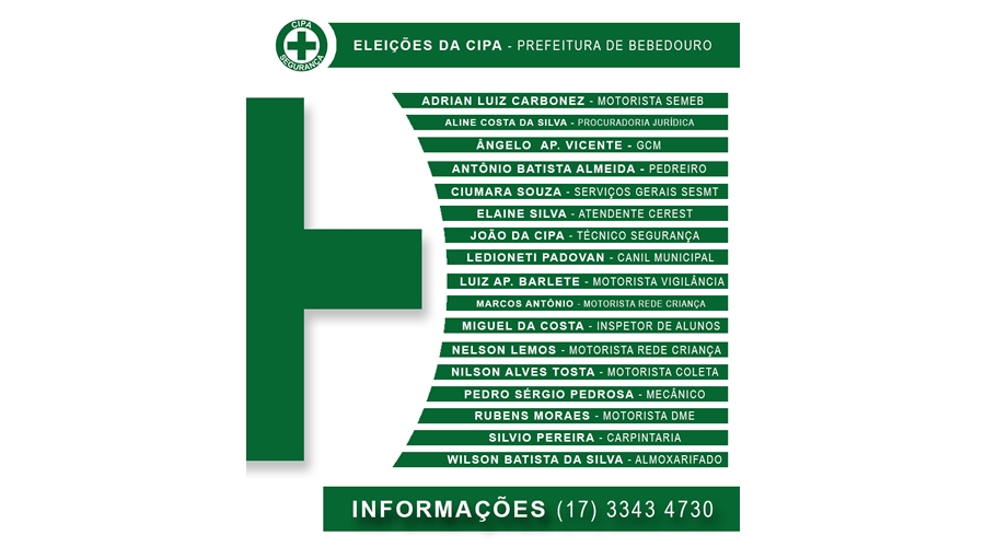 A Prefeitura de Bebedouro, por meio do Departamento de Recursos Humanos e Serviço Especializado em Engenharia de Segurança e Medicina do Trabalho (SESMT), realizará a partir da segunda-feira (22/04) até a sexta-feira (26/04), a eleição para a escolha dos servidores municipais que integrarão o quadro de novos membros da Comissão Interna de Prevenção de Acidentes (CIPA) Gestão 2019/2020. As urnas para votação estarão disponíveis no paço municipal e diversos setores da Prefeitura.